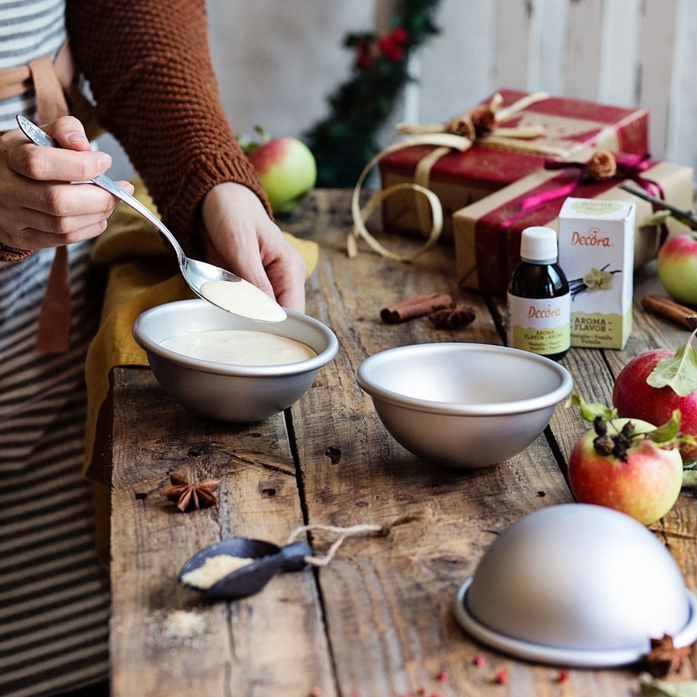 Aus eloxiertem Aluminium ohne Schweißpunkte. Ideal für die Herstellung von Kuchen mit halbkugelförmigen Formen. Es ist möglich, eine Kugelform zu erhalten, indem zwei Hälften nebeneinander verbunden werden.