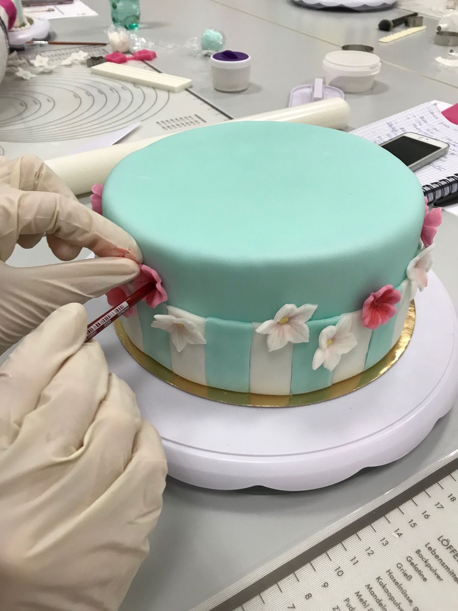 Vorbereitung des Tortenrohlings für das Eindecken mit Fondant. D.h. Zuschneiden, Einstreichen mit Buttercreme, Füllen. Diese Arbeitschritte bereiten wir zeitbedingt für Sie vor. Die Dozentin zeigt aber alle Techniken an einem echten Kuchen.